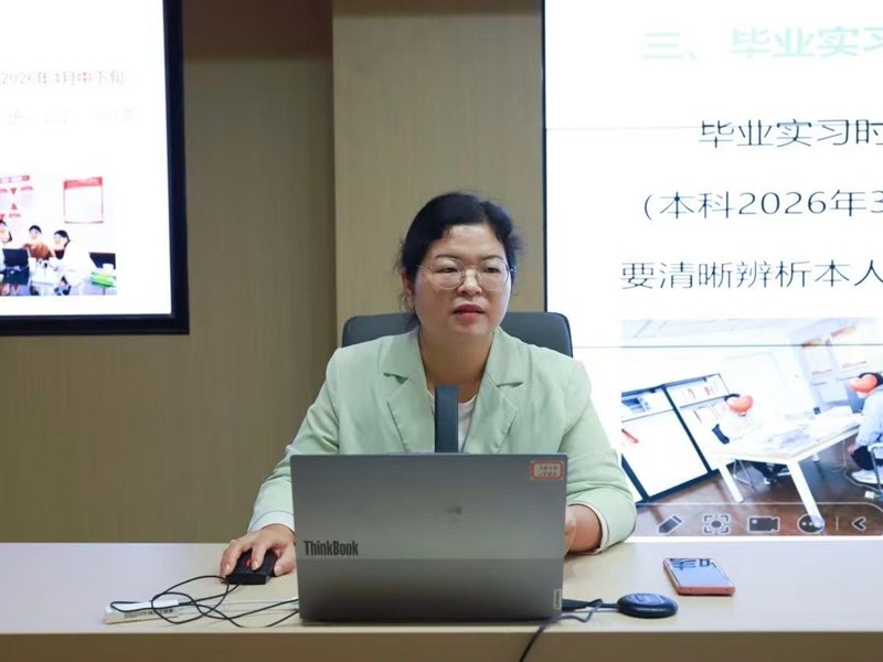 活动伊始,郭老师对2026届毕业实习生做大致回顾与总结,强调了毕业实习是学生熟悉社会、开阔视野,理论与实践结合的重要教学环节,是增强学生社会意识和责任意识,提高学生专业素养和综合素质、培养和锻炼学生的实际工作能力重要途径。随后,她详细介绍了集中实习与分散实习的区别,并强调了实习需要注意的情况以及纪律要求,要求学生每周提交实习日志,每月开展线上汇报。最后,郭姗老师对本次活动作出总结,建议同学们要端正态度,珍惜实习机会,将所学专业知识灵活运用到实习工作中,努力提升自身的综合素质。